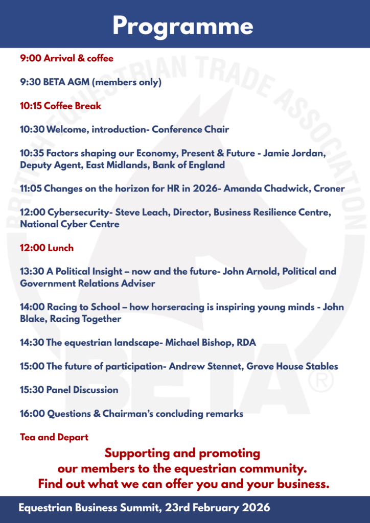 You will be able to network and listen to a full day of speakers addressing topics relevant to all equestrian businesses including: cybersecurity; Future changes to HR legislation, an economic outlook, the political landscape in 2026 and a focus on future of equestrianism with panel discussion on challenges and opportunities!